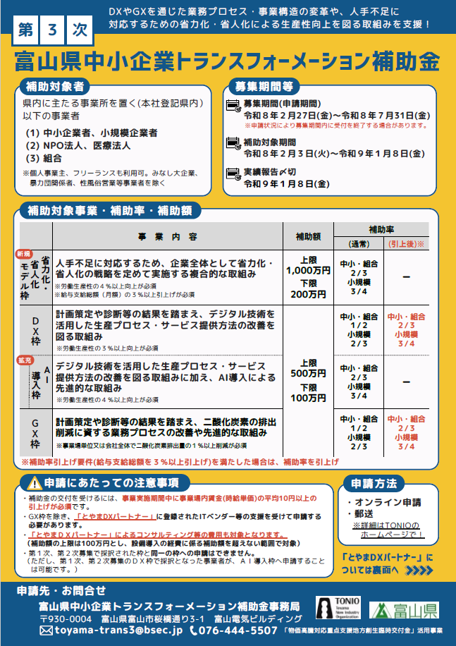 第3次 富山県中小企業トランスフォーメーション補助金 のご案内