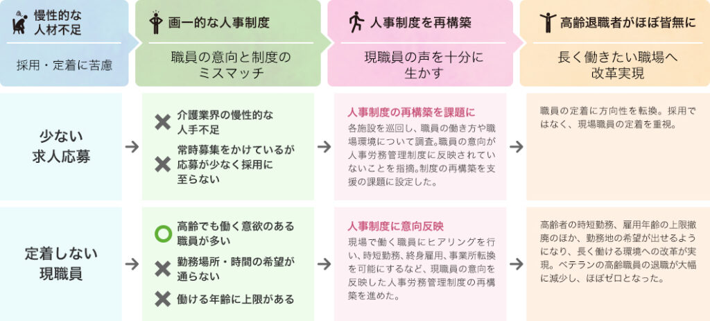 現場で働く職員の意見を真摯に聞くことを心掛けた。「定着しやすく、働きやすい職場」がどのような職場であるかを何よりも第一に考え、相談者が実現できる具体的な人事施策の提案を行った。